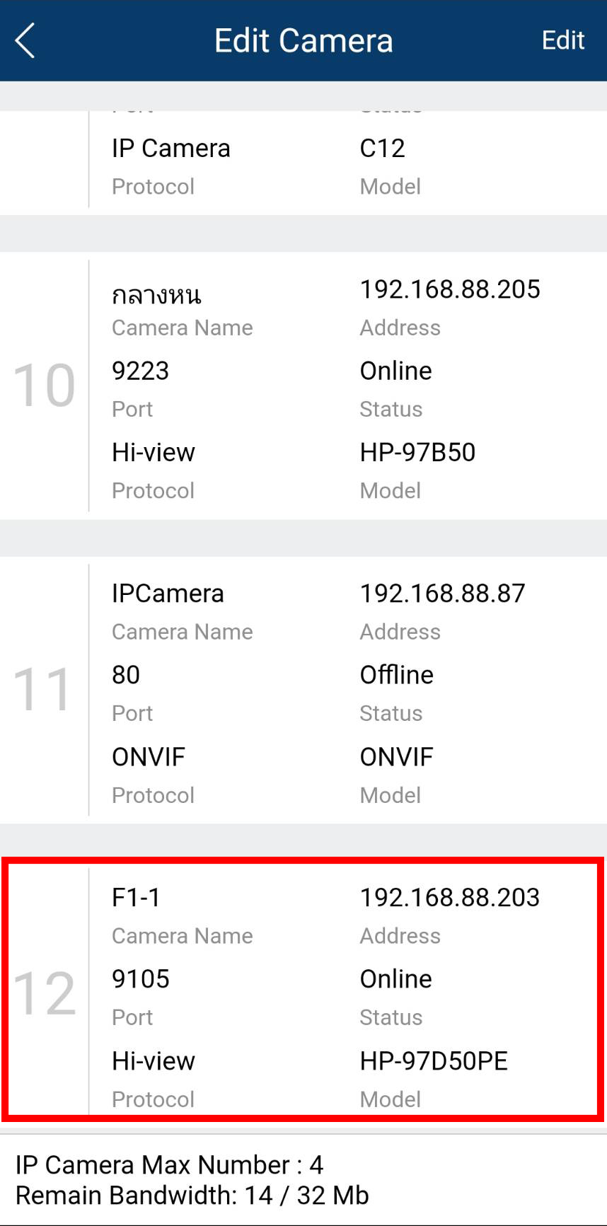Edit Camera หน้าเเก้ไขกล้องแสดงสถานะกล้องที่เเอด