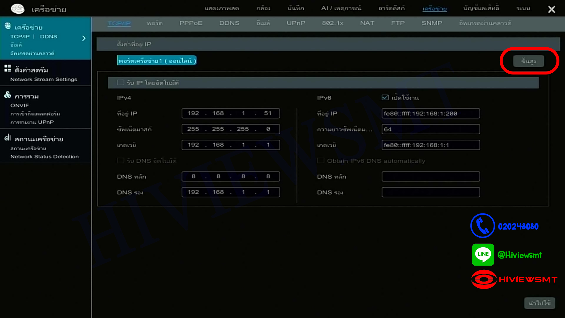 เมนูล่างซ้าย > ตั้งค่า > เครือข่าย > TCP/IP > ขั้นสูง