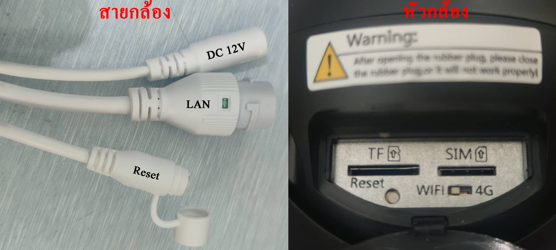2.ต่อ Adapter DC 12V และ LAN สายอินเทอร์เน็ต รอกล้องบูท แล้วทำการ รีเซ็ตตัวกล้อง โดยการกดปุ่ม Reset ที่ สายกล้อง หรือ หัวกล้อง *สำหรับกล้อง 4G ต้อง ดิฟสวิตช์ ไปเป็นโหมด Wifi ที่หัวกล้อง