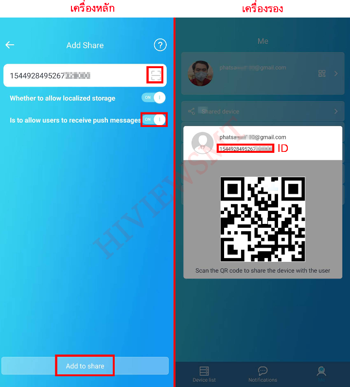 เครื่องหลัก : Add Share > สแกน QR Code หรือ กรอกเลข ID ของเครื่องรอง