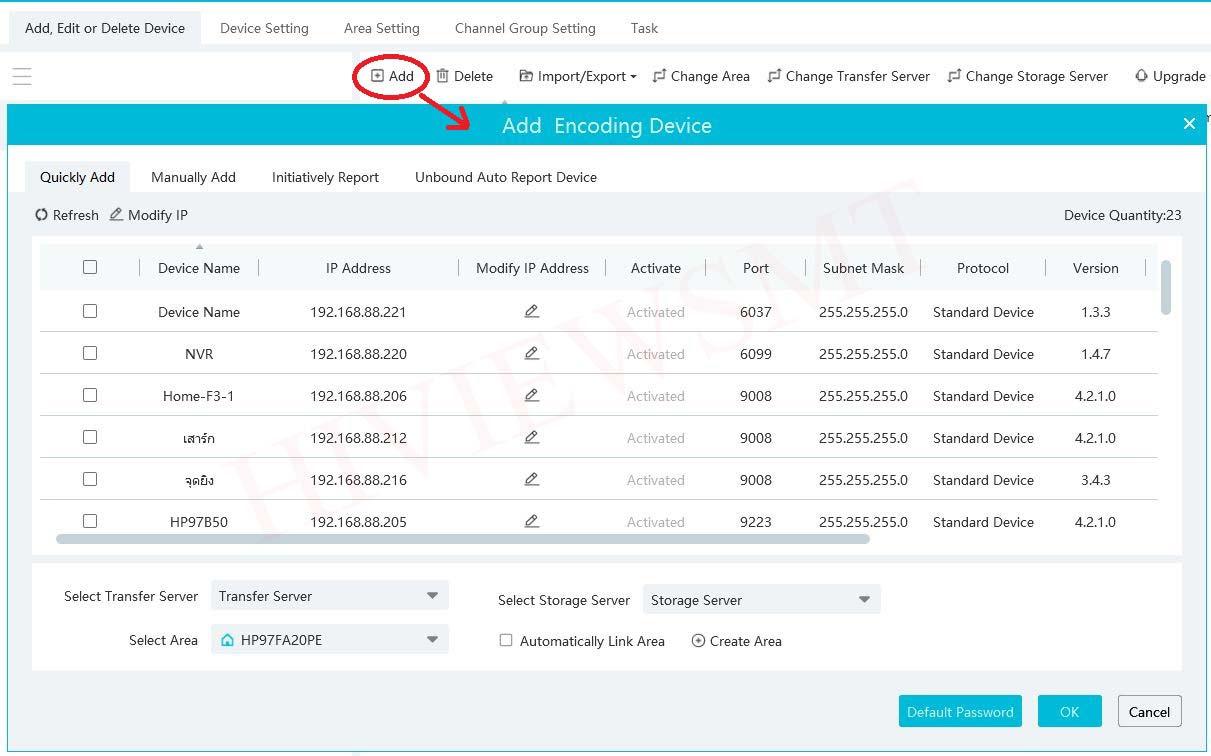 จากนั้นคลิก "Add" เพื่อเพิ่มอุปกรณ์ คุณสามารถเพิ่มอุปกรณ์หลายรายการในอินเทอร์เฟซนี้ เช่น IPC ตรวจจับใบหน้า, IPC/NVR จดจำใบหน้า,เทอร์มินัลจดจำใบหน้า, IPC ตรวจจับที่ใช้งานอยู่, กล้อง ANPR เป็นต้น