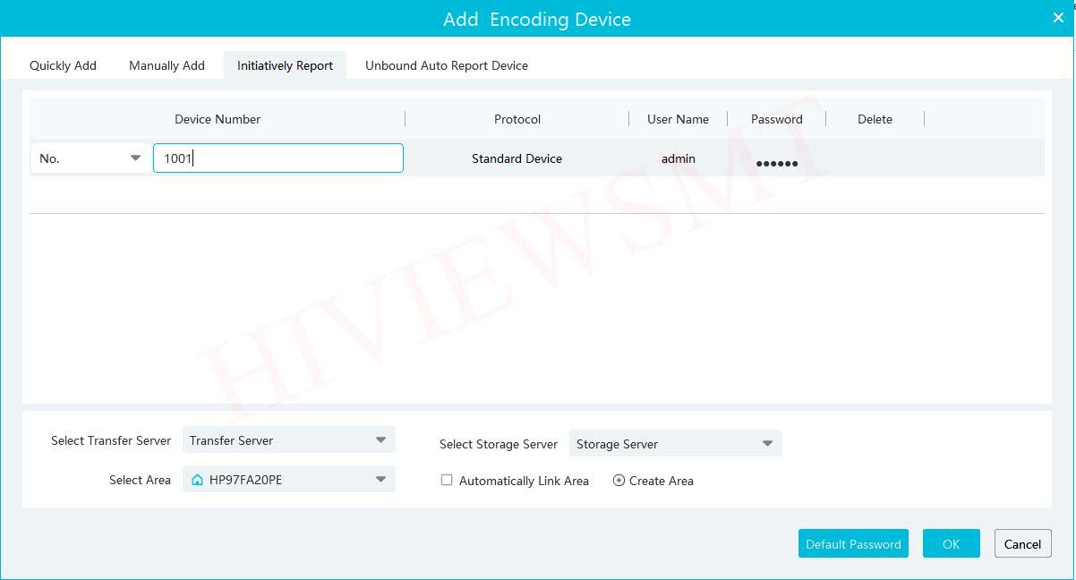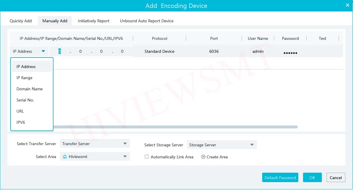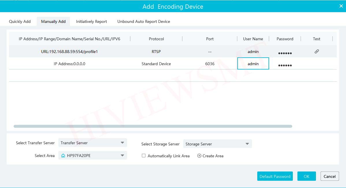 คลิก "Default password" เพื่อตั้งชื่อผู้ใช้และรหัสผ่านเริ่มต้นของอุปกรณ์จากผู้ผลิตรายต่างๆ เช่น Hikvision, Dahua เป็นต้น ชื่อผู้ใช้เริ่มต้นของอุปกรณ์มาตรฐานคือ "admin และรหัสผ่านเริ่มต้นของอุปกรณ์มาตรฐานคือ "123456"