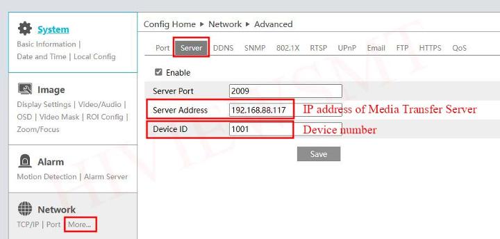 หากจำเป็นต้องเพิ่มกล้อง IP โปรดไปที่ Network Configuration Server Configuration of the IP camera ทำเครื่องหมายที่ "Enable" ป้อนที่อยู่ IP และพอร์ต (ค่าเริ่มต้น 2009) ของ NVMS จากนั้นตั้งค่าหมายเลขอุปกรณ์ของกล้อง IP