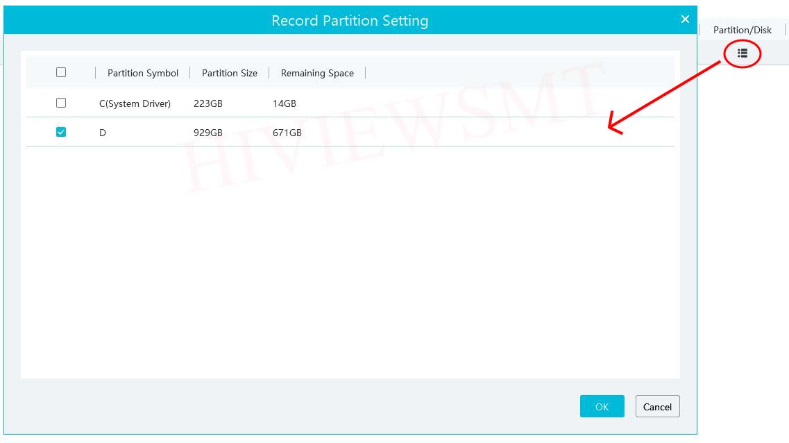 หลังจากเพิ่มเซิร์ฟเวอร์ที่เก็บข้อมูลแล้ว ให้คลิก เพื่อตั้งค่าพาร์ติชันเรคคอร์ด ในอินเทอร์เฟซการตั้งค่าพาร์ติชันบันทึก เลือกดิสก์และคลิก [OK] เพื่อ