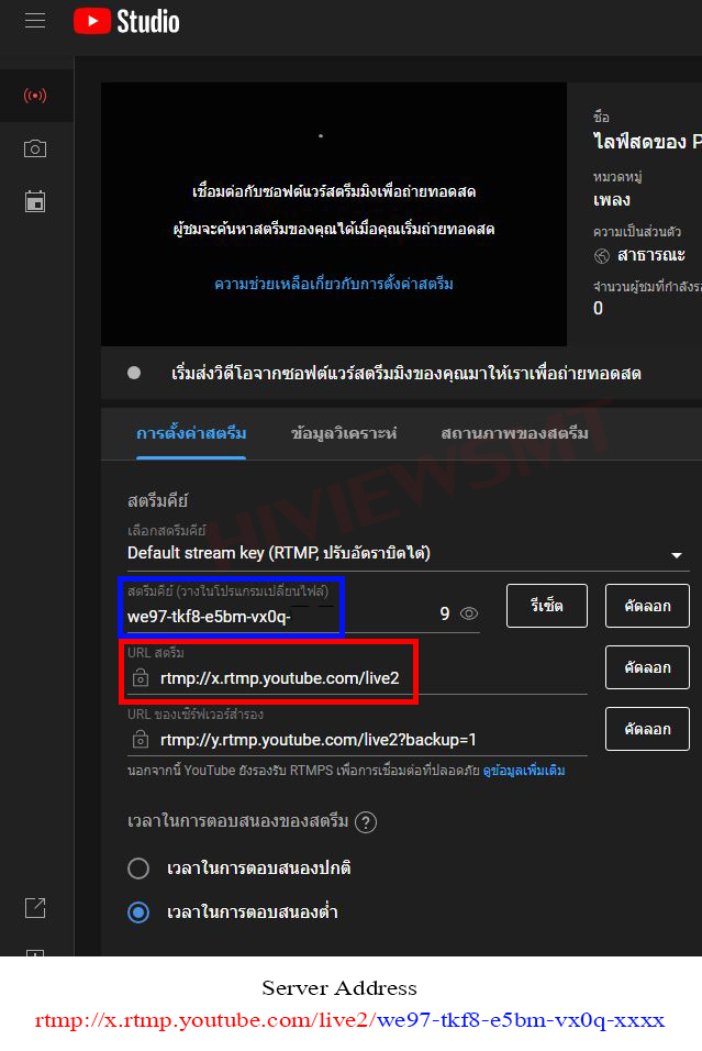 2.เข้า www.youtube.com > ไลฟ์สด > Server Address กรอกที่ข้อ 3.
