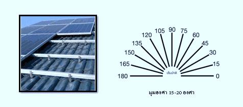 ควรมีความลาดชัน 15- 20 องศา กับพื้นดิน จะทำให้แสงอาทิตย์ กระทบตั้งฉากกับแผงเซลล์ใน ช่วงตอนเที่ยงมากที่สุด