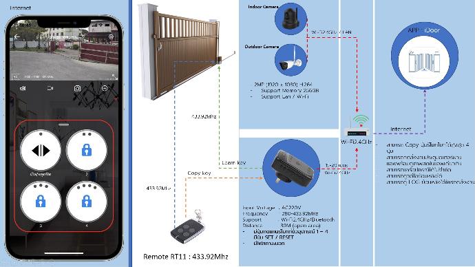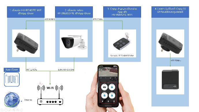 HP-31B20D/RE กับWiFiและCopyสัญญาณของรีโมทจากนั้น Learn ปุ่มรีโมทที่ Copy ไว้เข้ากับบอร์ดประตูมอเตอร์ เพียงเท่านี้เราก็สามารถกดสั่งงานควบคุมประตูมอเตอร์ ผ่าน 4G/5G แอปพลิเคชัน iDoor พร้อมทั้งสามารถดูภาพสดของกล้องที่ติดตั้งไว้ดูประตูหน้าบ้าน(ใช้งานร่วมกับ HP-31B20D/RE)