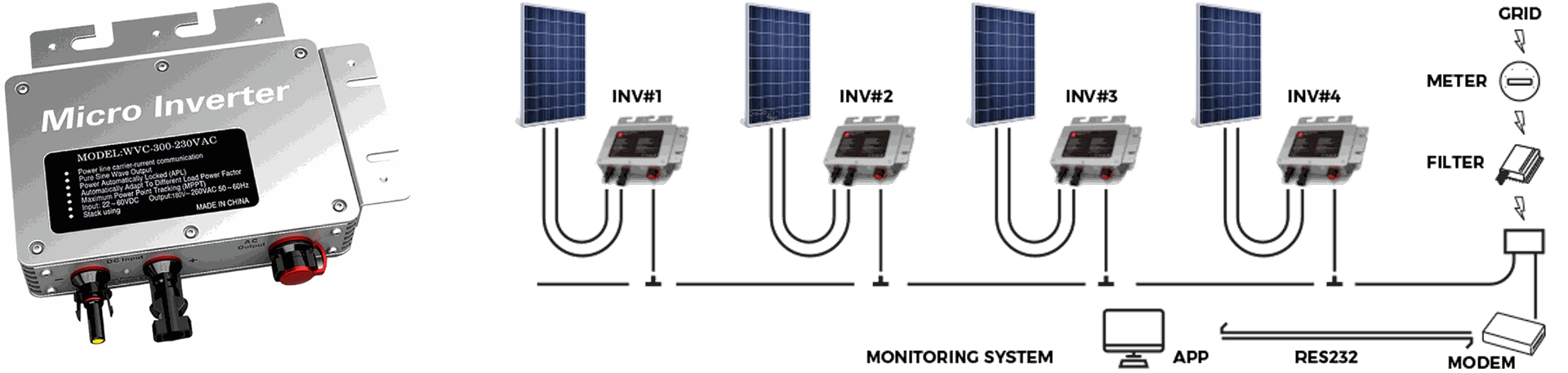 4. Solar Micro Inverter เป็นอินเวอร์เตอร์ที่สามารถนำมาใช้ในระบบออนกริด โดยความพิเศษของอินเวอร์เตอร์ชนิดนี้คือ มันถูกออกแบบมาให้มีขนาดเล็กมาก สามารถนำไปติดตั้งที่แผงโซล่าเซลล์เพื่อใช้งานได้เลย โดยสามารถใช้งานได้ 1 ตัวต่อ 1 แผง , 1 ตัวต่อ 2 แผง หรือ 1 ตัวต่อ 4 แผง ขึ้นอยู่กับแต่ละตัวที่ทางแบรนด์ผลิตออกมา ซึ่งเอาท์พุทที่ออกมาจากอินเวอร์เตอร์ชนิดนี้จะเป็นไฟฟ้าแบบ AC ที่สามารถนำไปต่อใช้งานต่อได้เลย
