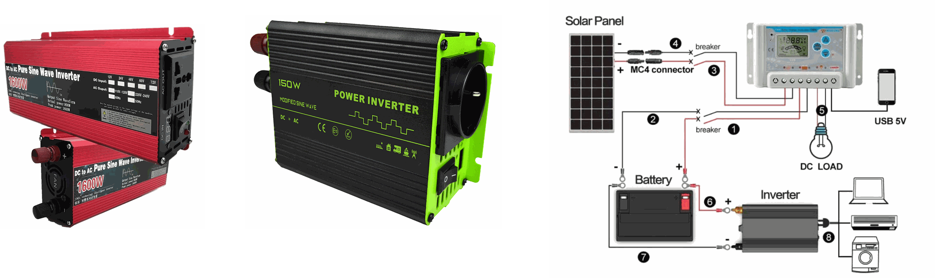 Inverter : ทำหน้าที่ในการแปลงไฟฟ้า จาก ไฟฟ้ากระแสตรง (DC) ไปเป็นไฟฟ้ากระแสสลับ (AC) เพื่อใช้งานกับเครื่องใช้ไฟฟ้าภายในบ้านที่ใช้ไฟฟ้ากระแสสลับ(AC) โดย Inverter จะมีอยู่ 6 ประเภทด้วยกัน อินเวอร์เตอร์ (Solar Inverter) เป็นอุปกรณ์ที่ใช้สำหรับแปลงไฟฟ้า DC ที่ได้จากแผงโซล่าเซลล์ ให้กลายเป็นไฟฟ้า AC เพื่อให้สามารถใช้งานกับเครื่องใช้ไฟฟ้าต่าง ๆ ได้ โดยในปัจจุบันมีด้วยกันทั้งหมด 6 ชนิด คือ