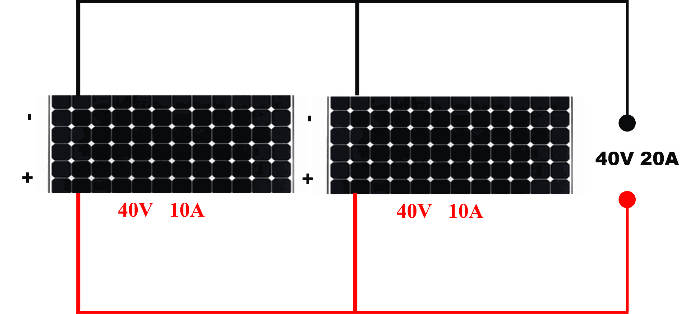 การต่อแบบขนาน – คือนำขั้วบวกของโซล่าเซลล์แผงหนึ่งไปต่อกับขั้วบวกของโซล่าเซลล์อีกแผงหนึ่ง และนำขั้วลบแผงหนึ่งไปต่อกับขั้วลบอีกแผงหนึ่ง การต่อแบบนี้จะทำให้กระแสไฟฟ้าเพิ่มขึ้นแต่แรงดันเท่าเดิม ตัวอย่างถ้ามีแผงโซล่าเซลล์ตามรูปด้านล่าง 2 แผงนำมาต่อแบบขนานจะได้แรงดันรวมของระบบ 40 โวลต์และกระแสไฟฟ้ารวม 20 แอมป์
